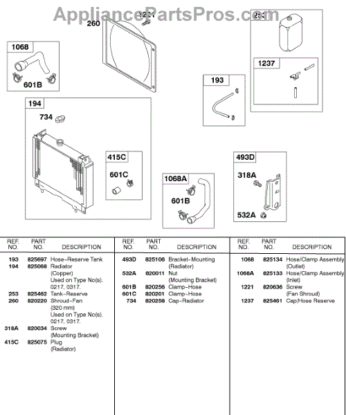 Parts for Briggs & Stratton 433447-0115-01: Radiator, Hoses, Reserve Tank Parts