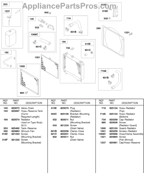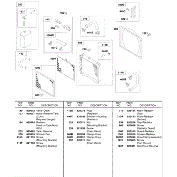 Parts for Briggs & Stratton 584447-0210-E2: Radiator, Screens, Reserve Tank, Drain Valve Parts