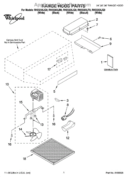 Parts for Whirlpool RH2324XJQ0: 01 - Range Hood Parts