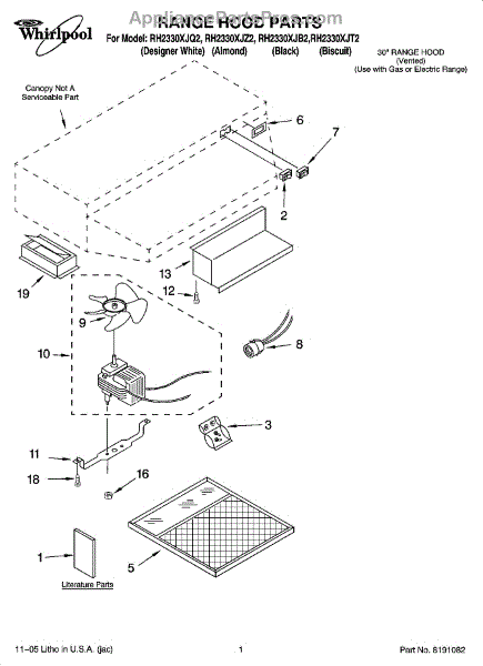Parts for Whirlpool RH2330XJT2: 01 - Range Hood Parts