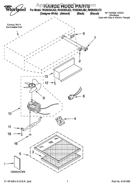 Parts for Whirlpool RH2630XJT2: 01 - Range Hood Parts