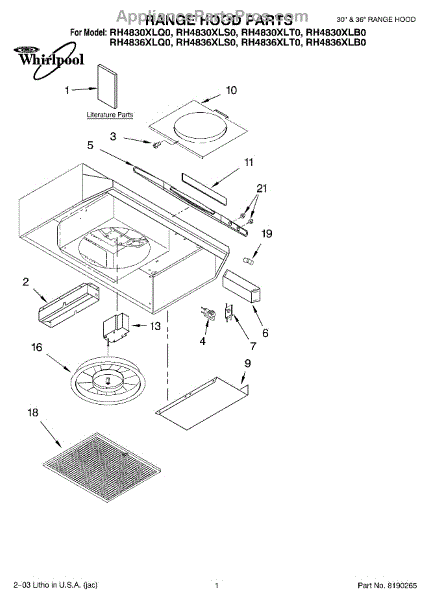 Parts for Whirlpool RH4830XLB0: 01 - Range Hood Parts
