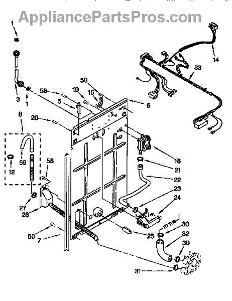 Replaces the vacuum break inlet hose connecting the water inlet to your washer tub. Needed when original hose is cracked, burst, leaking, or damaged.