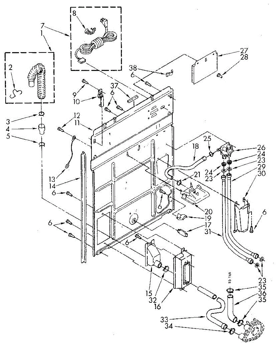 Structural bracket that secures the rear panel to the washer chassis. Replace if cracked, broken, or missing to restore proper alignment and cabinet stability.