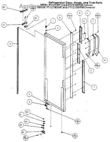 Parts for Amana 36538-P1121904W: Refrigerator Door, Hinge And Trim Parts