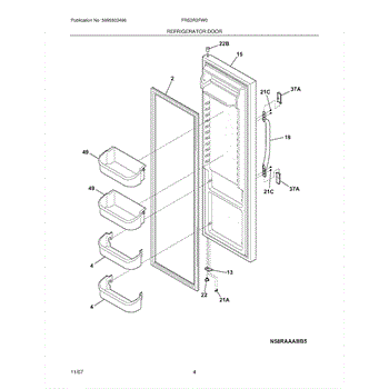 Upper door hinge bearing provides a low-friction bushing for the top hinge pin. Replace if worn, cracked, or causing squeaking sounds during door operation.