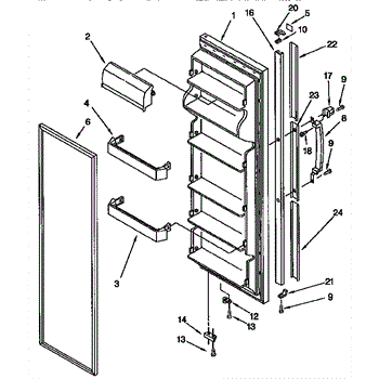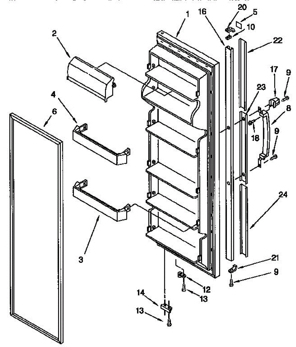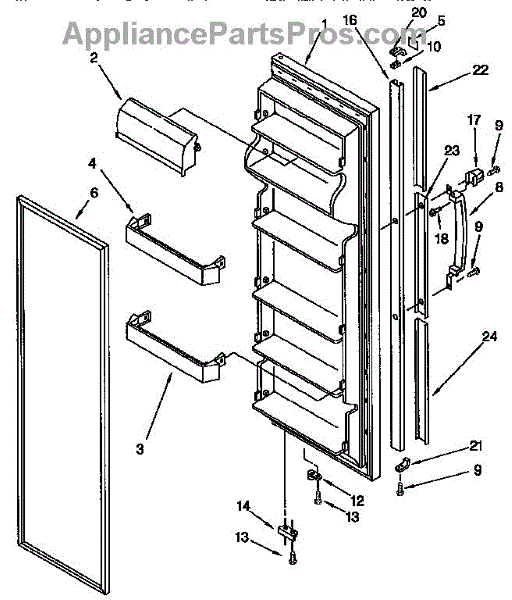 Seals refrigerator door to prevent warm air entry and maintain temperature. Replace if cracked, torn, or doors won't close tightly. Verify fit by model.