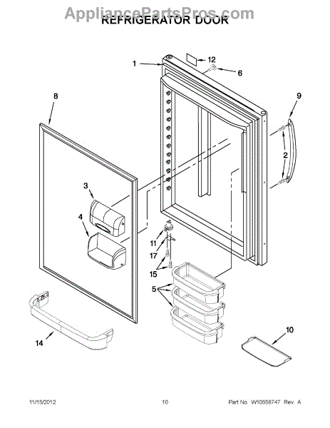 The Bin-Cntlvr (Cantilever Bin) is an OEM part for Whirlpool refrigerators. This bin attaches to the refrigerator door and provides additional storage space for items like bottles, condiments, and other small containers. The cantilever design allows for easy adjustment and customization of shelf space within the refrigerator door.