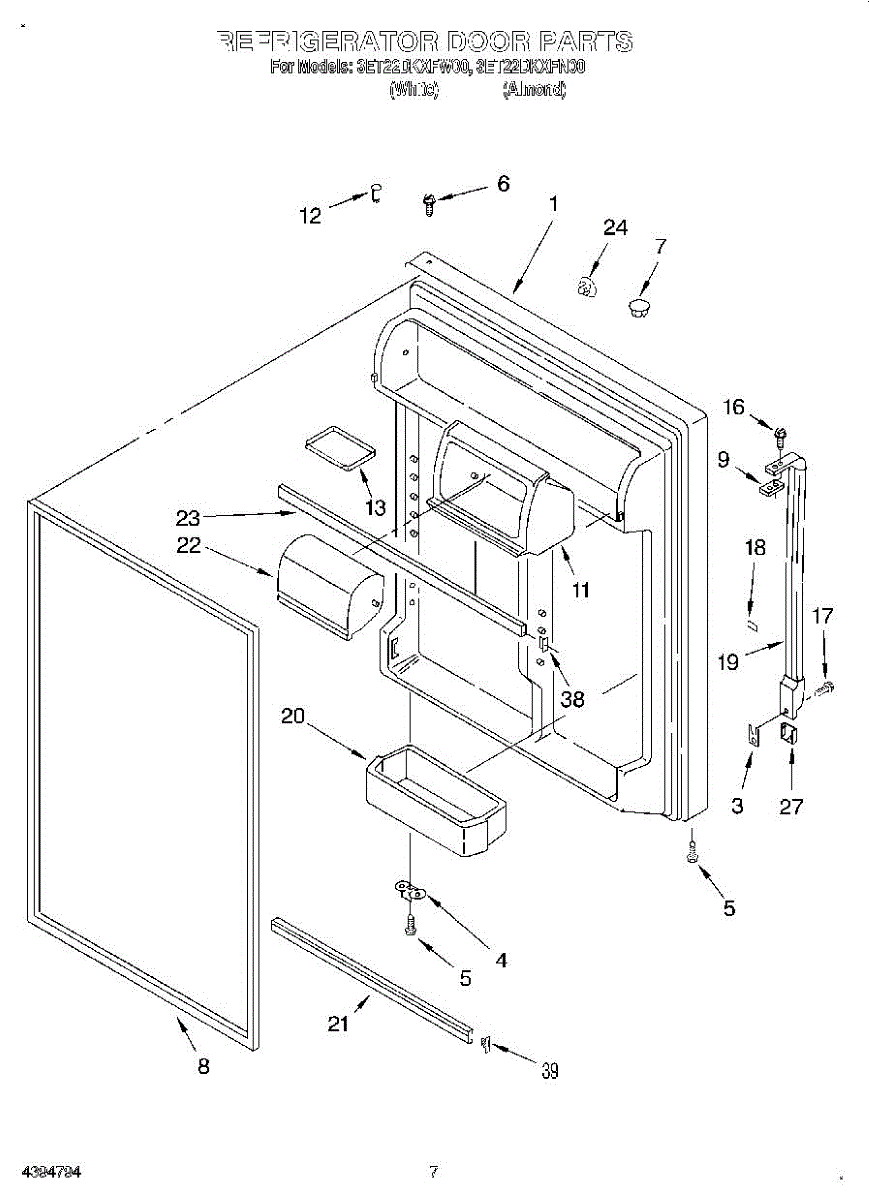 The Door Bin is an OEM replacement part for Whirlpool refrigerators. It is a removable plastic storage bin mounted inside the upper refrigerator door. This bin provides convenient access for eggs, condiments, and other small items with the door open.