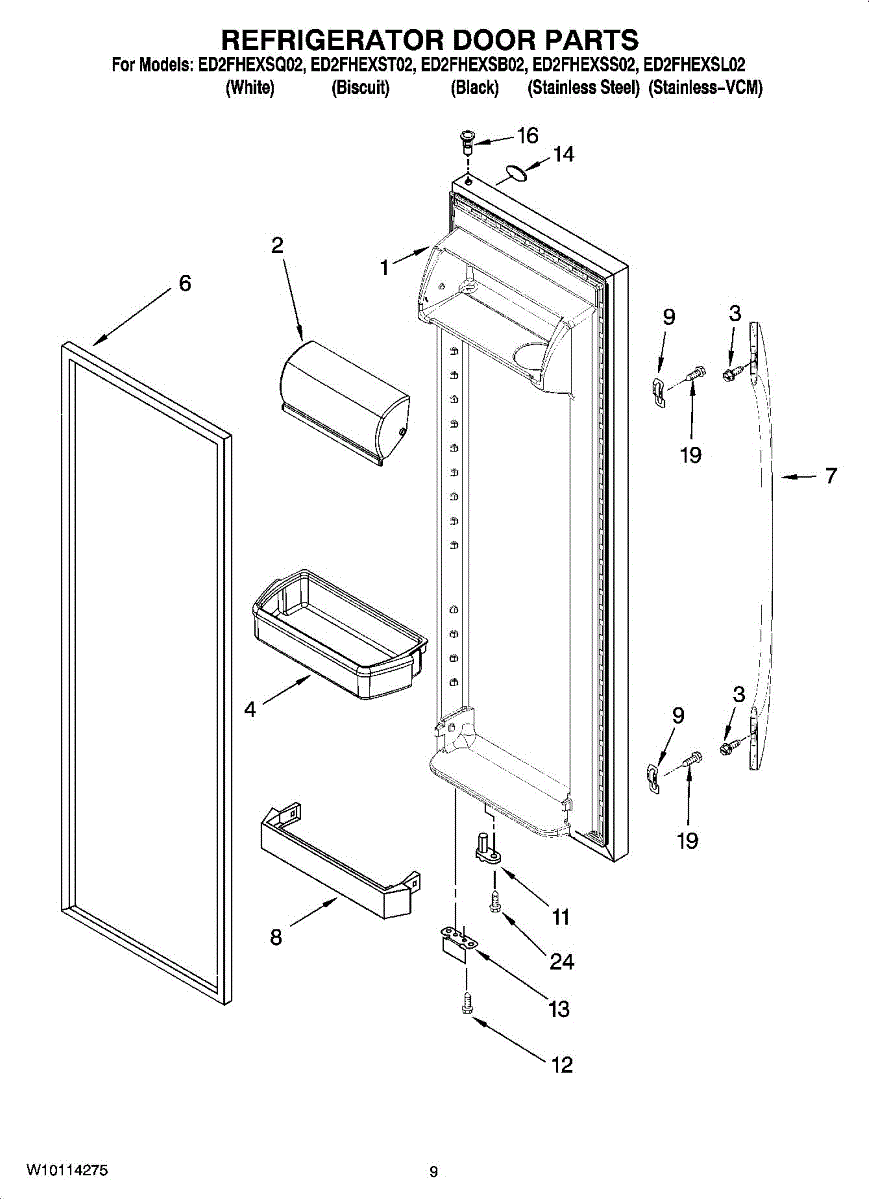 Clear plastic storage bin that attaches to the refrigerator door to hold bottles, jars, and condiments. Replace if cracked, broken, or missing.
