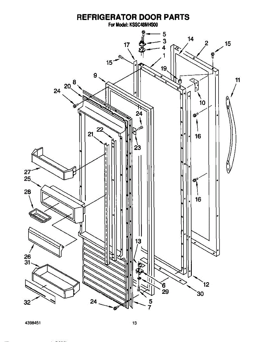 This screw is used to secure the handle end cap to the center of the door. The screw size measures 8-18 x 1/2 inches.