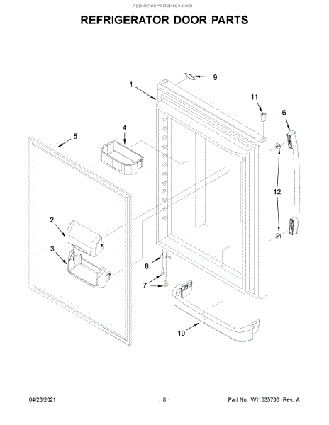 Complete refrigerator door assembly for bottom-mount models. Replaces cracked, damaged, or warped doors. Includes outer panel and mounting hardware.