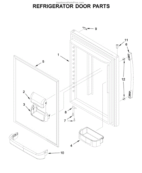 Small door bin mounts on the inner refrigerator door panel for organized storage. Replaces cracked, loose, or missing bins to restore usable space.