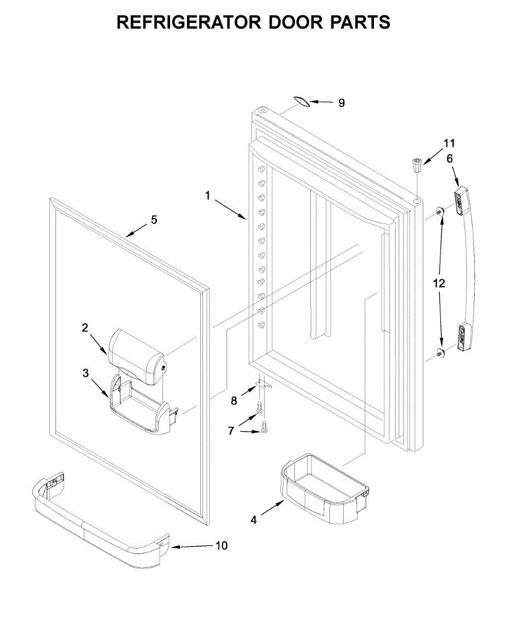 Complete refrigerator door assembly for bottom-mount models. Replaces cracked, damaged, or warped doors. Includes outer panel and mounting hardware.