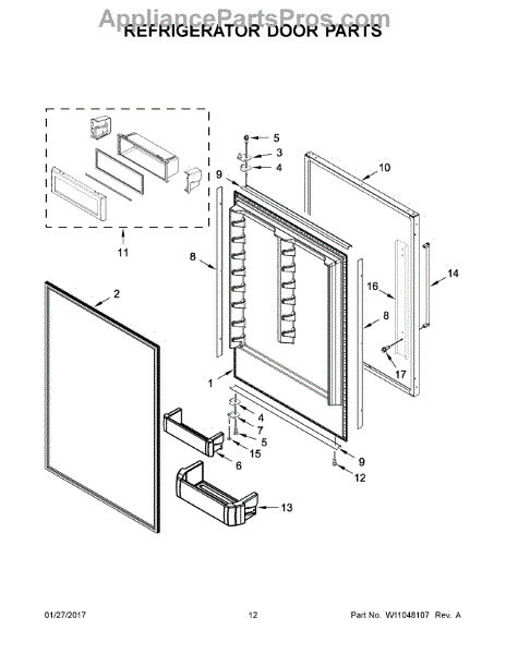 This shallow freezer door bin mounts on the inner door and restores organized storage for smaller items. Replace a cracked, loose, or missing bin to keep packages secure and easy to access.