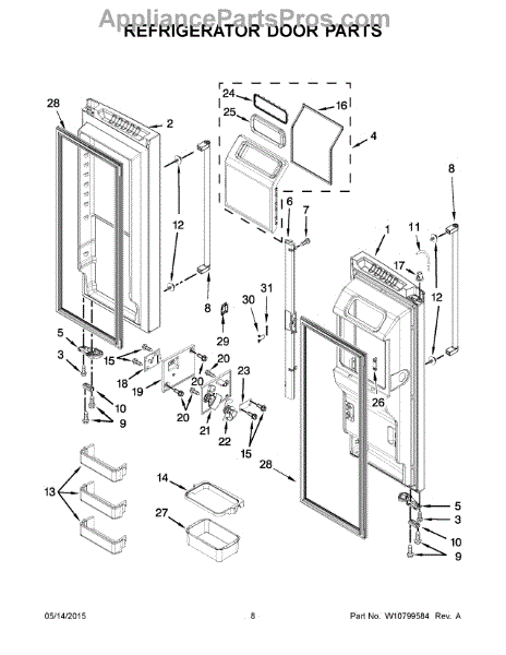 The Door Bin is an OEM part for Whirlpool side-by-side refrigerators. Located internally on the refrigerator door, it provides convenient storage for taller items like bottles and cartons.