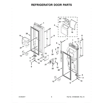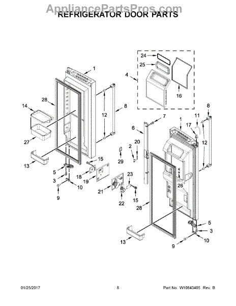 The Door Bin is an OEM part for Whirlpool side-by-side refrigerators. Located internally on the refrigerator door, it provides convenient storage for taller items like bottles and cartons.