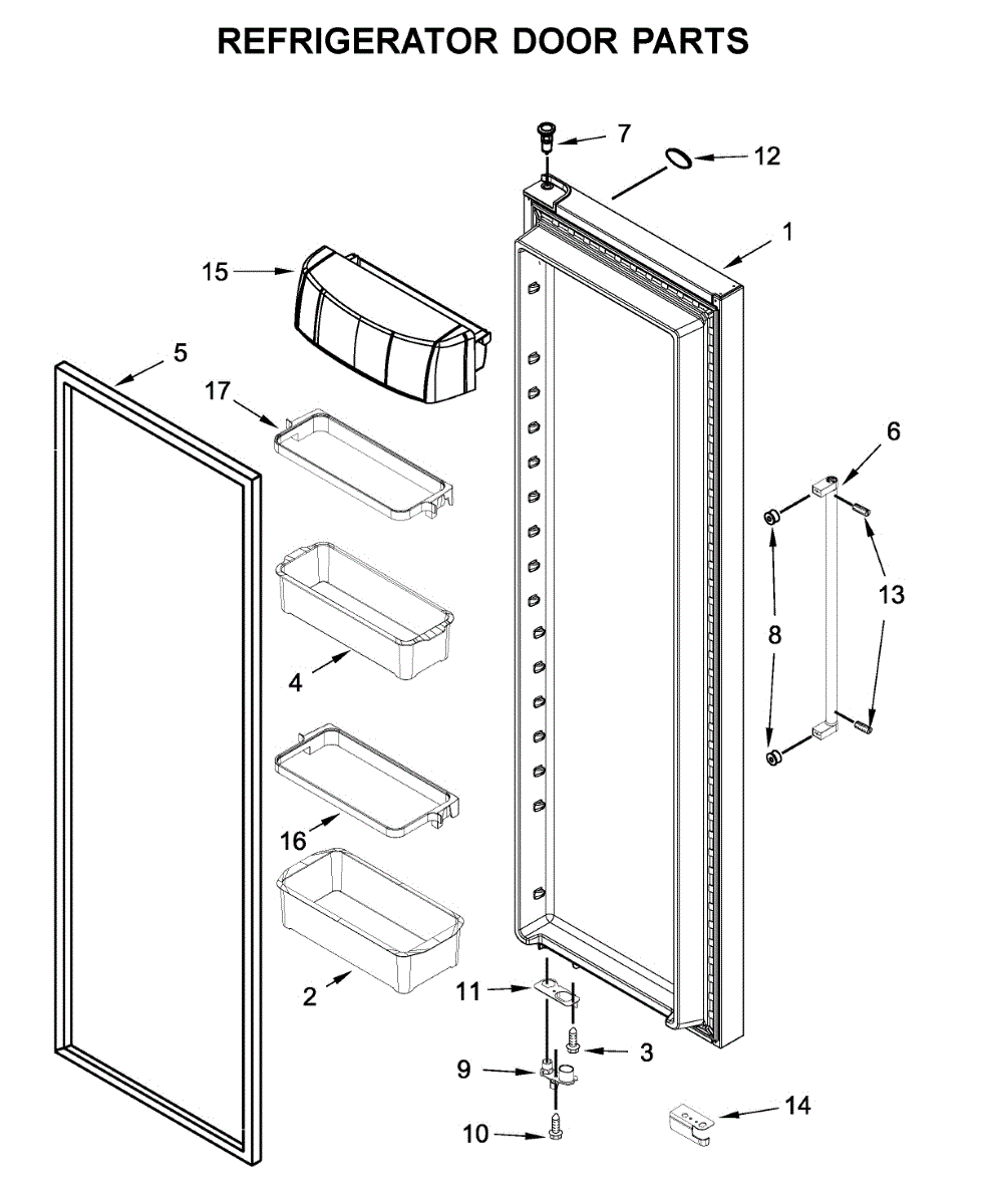 The Door Bin Frame is an OEM part for Whirlpool refrigerators. This part supports the removable door bins, which are used for storing smaller items like beverages, condiments, or dairy products.