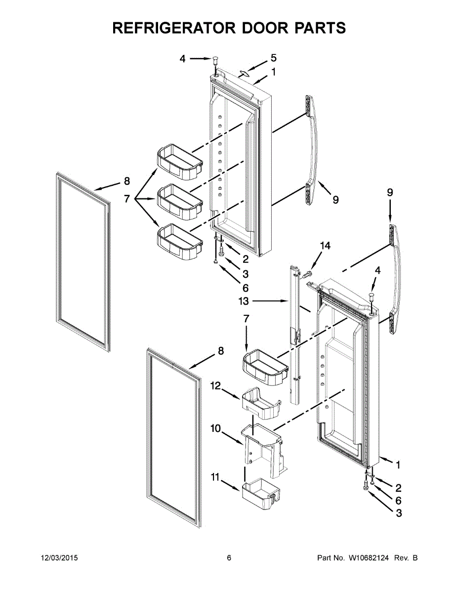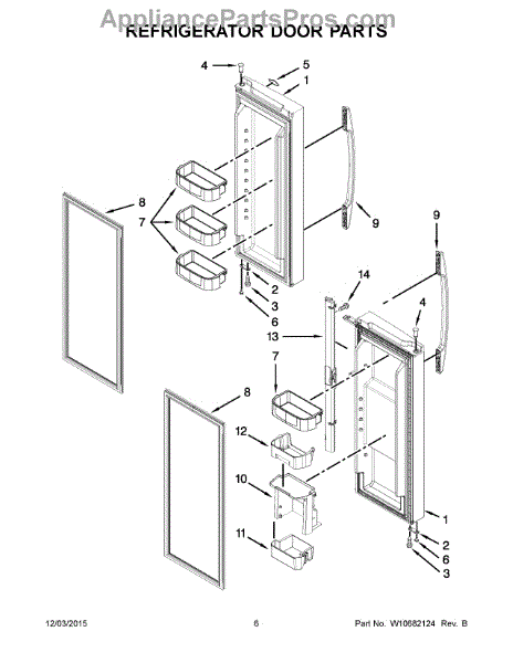 Replacement door shelf bin for refrigerator doors. Installs on interior door to hold bottles, jars, and small items. Replaces cracked, broken, or worn bins.