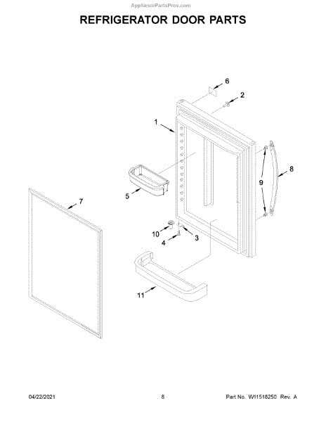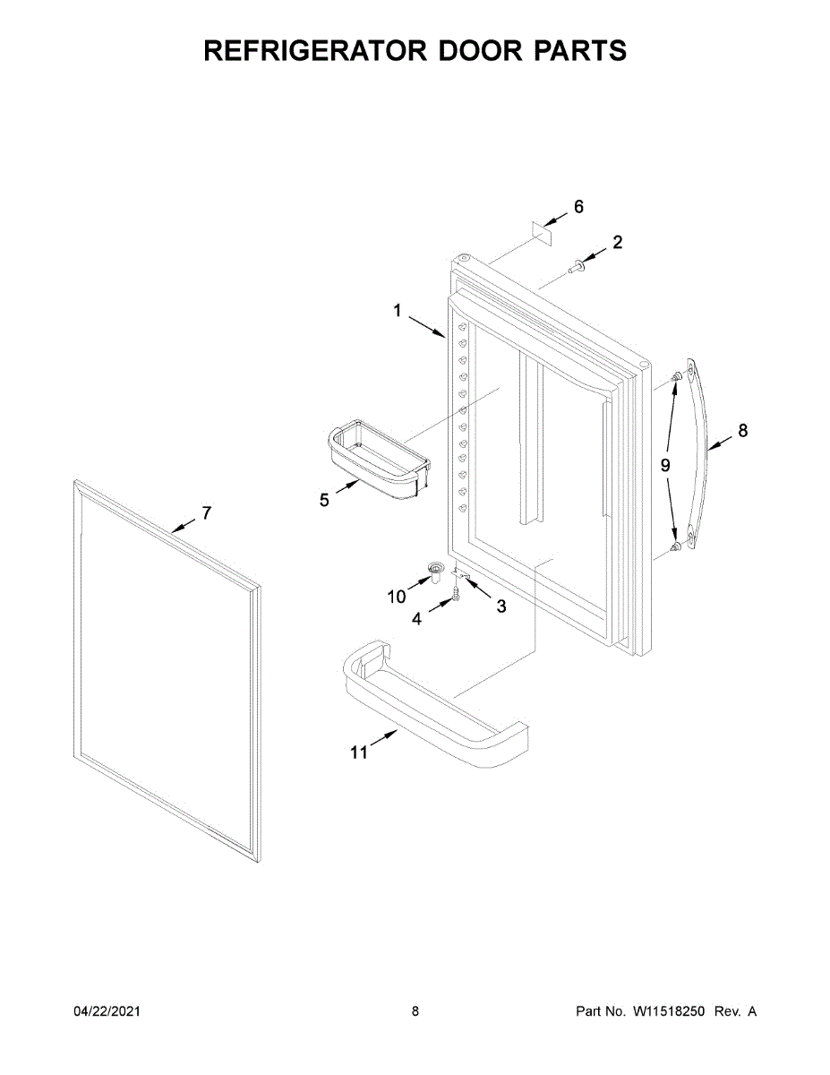 Replacement freezer door assembly for bottom-mount refrigerators. Needed when original door is cracked, damaged, or warped. Installs on lower compartment.