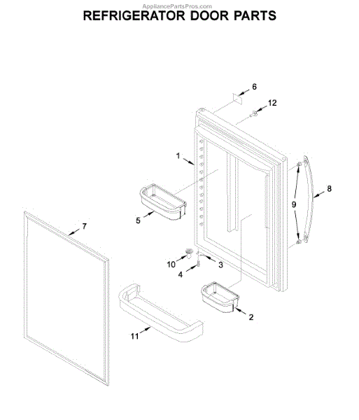 Complete refrigerator door assembly for bottom-mount models. Replaces cracked, damaged, or warped doors. Includes outer panel and mounting hardware.