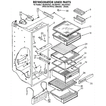 Secures interior shelves and rails to the refrigerator cabinet. Replace if broken, missing, or loose to restore proper support and prevent tilting shelves.