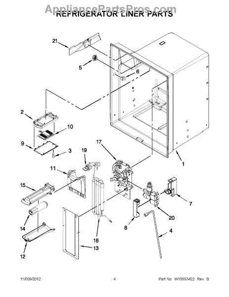 The Reservoir is a Whirlpool OEM replacement part for Whirlpool side-by-side refrigerators. This assembly does include the filter head. The filter head connects the external filter cartridge to the internal reservoir. The reservoir holds filtered water that is dispensed from the external door dispenser. Causes can be normal wear to sealing components, cracks in plastic from repeated pressure changes, or mineral buildup affecting water flow. Symptoms of a problem include: