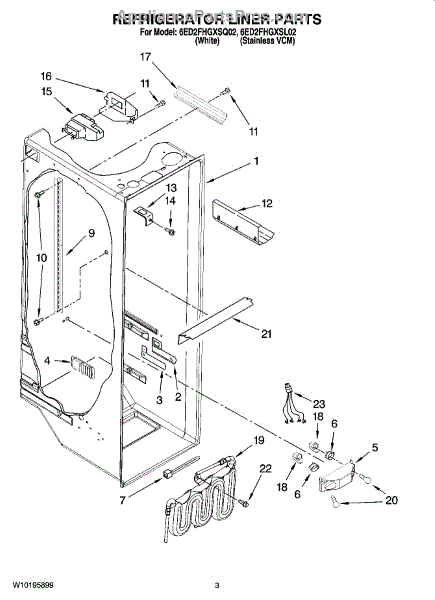 The Water Reservoir Tubing is an OEM replacement part for Whirlpool refrigerators. It is a flexible plastic tubing that replaces the water reservoir and holds the water for the ice maker and dispenser. Causes can include cracks from heat or cold exposure over time, punctures from sharp edges during installation, or deterioration of plastic tubing that impacts integrity. Symptoms of bad water reservoir tubing include: