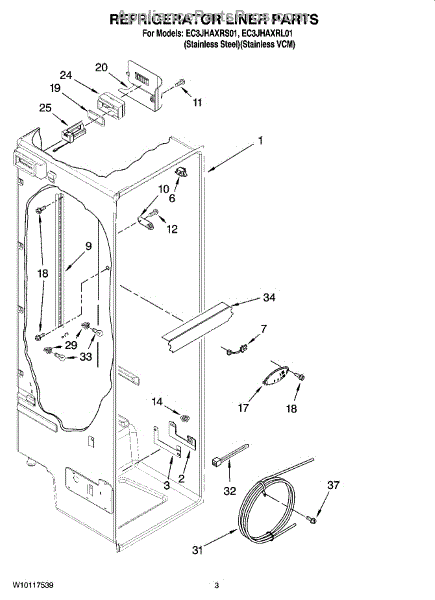 The Water Reservoir Tubing is an OEM replacement part for Whirlpool refrigerators. It is a flexible plastic tubing that replaces the water reservoir and holds the water for the ice maker and dispenser. Causes can include cracks from heat or cold exposure over time, punctures from sharp edges during installation, or deterioration of plastic tubing that impacts integrity. Symptoms of bad water reservoir tubing include: