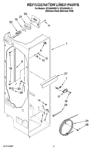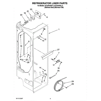 The Water Reservoir Tubing is an OEM replacement part for Whirlpool refrigerators. It is a flexible plastic tubing that replaces the water reservoir and holds the water for the ice maker and dispenser. Causes can include cracks from heat or cold exposure over time, punctures from sharp edges during installation, or deterioration of plastic tubing that impacts integrity. Symptoms of bad water reservoir tubing include: