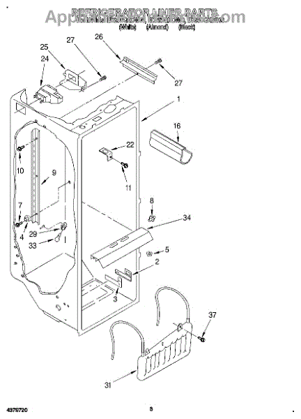 The Air Diffuser Assembly is an OEM part for Whirlpool refrigerators. It regulates the airflow between the refrigerator and freezer compartments, ensuring the proper distribution of cold air to maintain the desired temperatures in both sections.