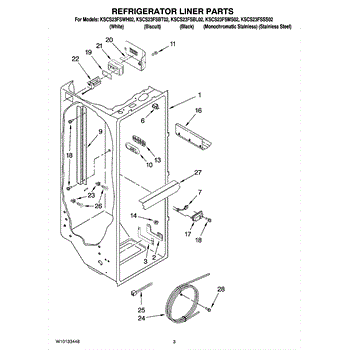 The Water Reservoir Tubing is an OEM replacement part for Whirlpool refrigerators. It is a flexible plastic tubing that replaces the water reservoir and holds the water for the ice maker and dispenser. Causes can include cracks from heat or cold exposure over time, punctures from sharp edges during installation, or deterioration of plastic tubing that impacts integrity. Symptoms of bad water reservoir tubing include: