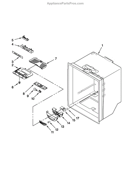 Outer cabinet housing for bottom-mount refrigerators. Supports and protects internal components. Replace when cracked, bent, or damaged to restore alignment.