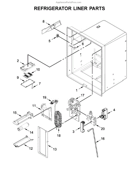 Housing cover for bottom-mount refrigerators. Replaces cracked, broken, or missing plastic housing. Installs inside refrigerator compartment.