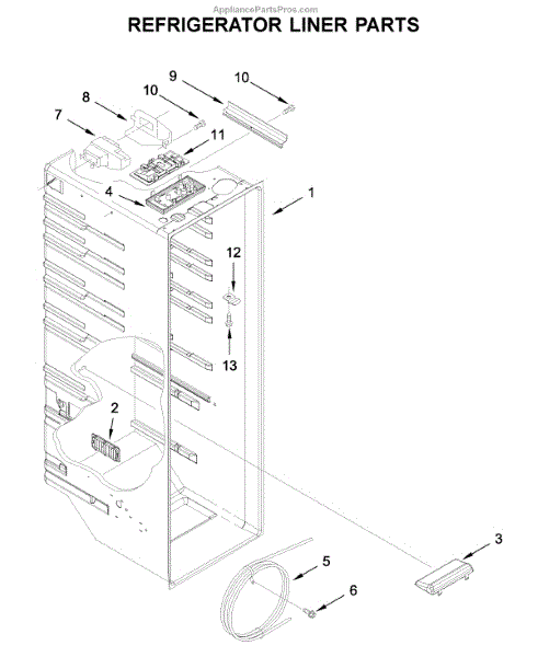 The Water Reservoir Tubing is an OEM replacement part for Whirlpool refrigerators. It is a flexible plastic tubing that replaces the water reservoir and holds the water for the ice maker and dispenser. Causes can include cracks from heat or cold exposure over time, punctures from sharp edges during installation, or deterioration of plastic tubing that impacts integrity. Symptoms of bad water reservoir tubing include:
