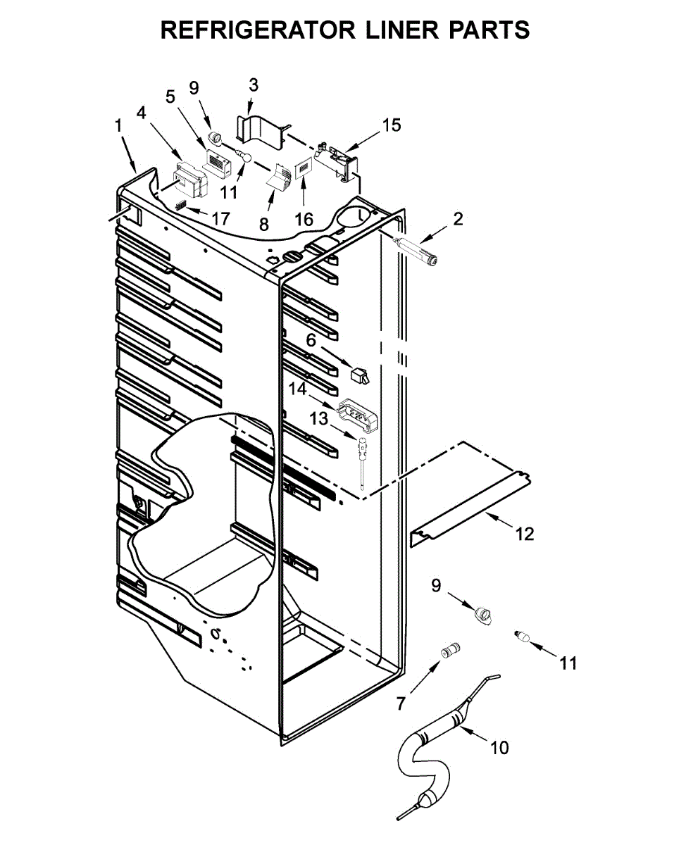 This refrigerator water filter housing assembly secures the water filter and channels water through the cartridge to the dispenser and ice maker. Replacing a damaged housing restores proper sealing, flow, and leak-free operation at the filter area.