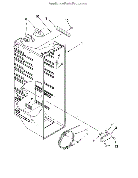 The Air Diffuser Assembly is an OEM part for Whirlpool refrigerators. It regulates the airflow between the refrigerator and freezer compartments, ensuring the proper distribution of cold air to maintain the desired temperatures in both sections.