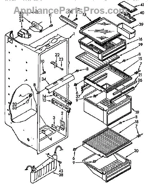 Secures interior shelves and rails to the refrigerator cabinet. Replace if broken, missing, or loose to restore proper support and prevent tilting shelves.