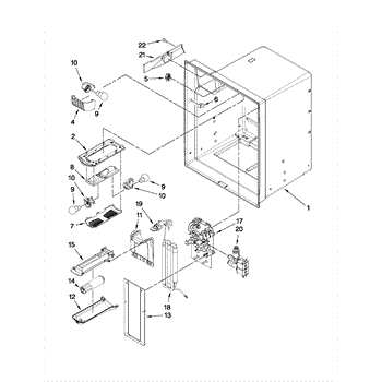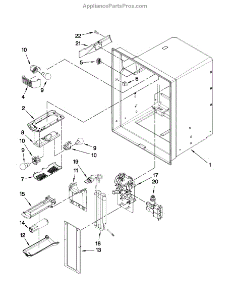 This is the refrigerator's water reservoir. It stores a small volume of water inside the fresh-food section so the dispenser delivers a steady, chilled supply. Replace a cracked or blocked tank to stop leaks and restore consistent flow. What it does