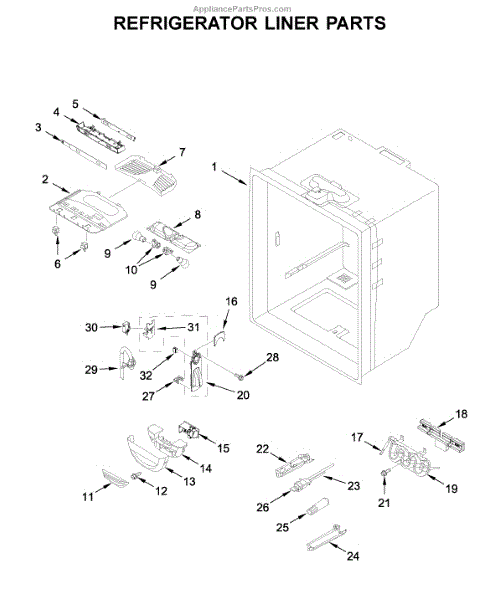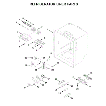 Outer cabinet housing for bottom-mount refrigerators. Supports and protects internal components. Replace when cracked, bent, or damaged to restore alignment.