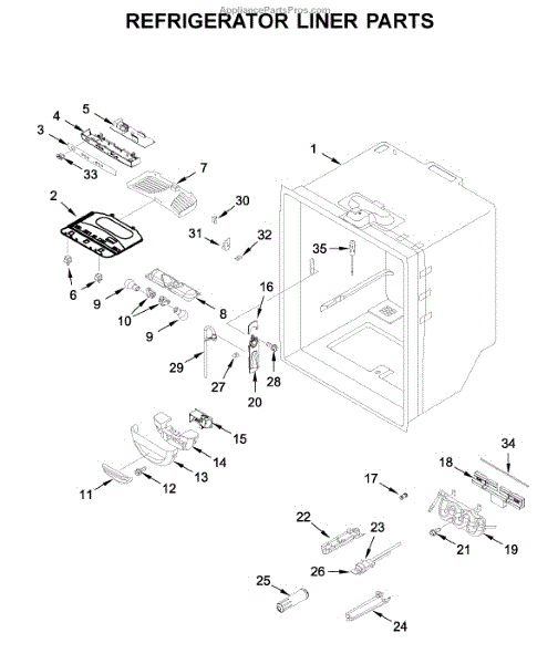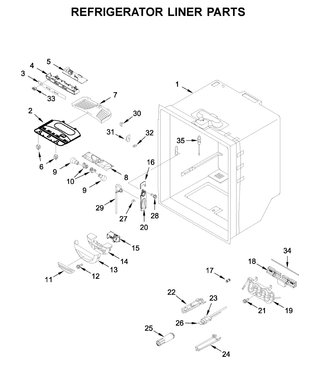 Stores chilled water in the fresh food compartment for steady dispenser flow. Replace if cracked, leaking, or damaged to stop interior leaks.
