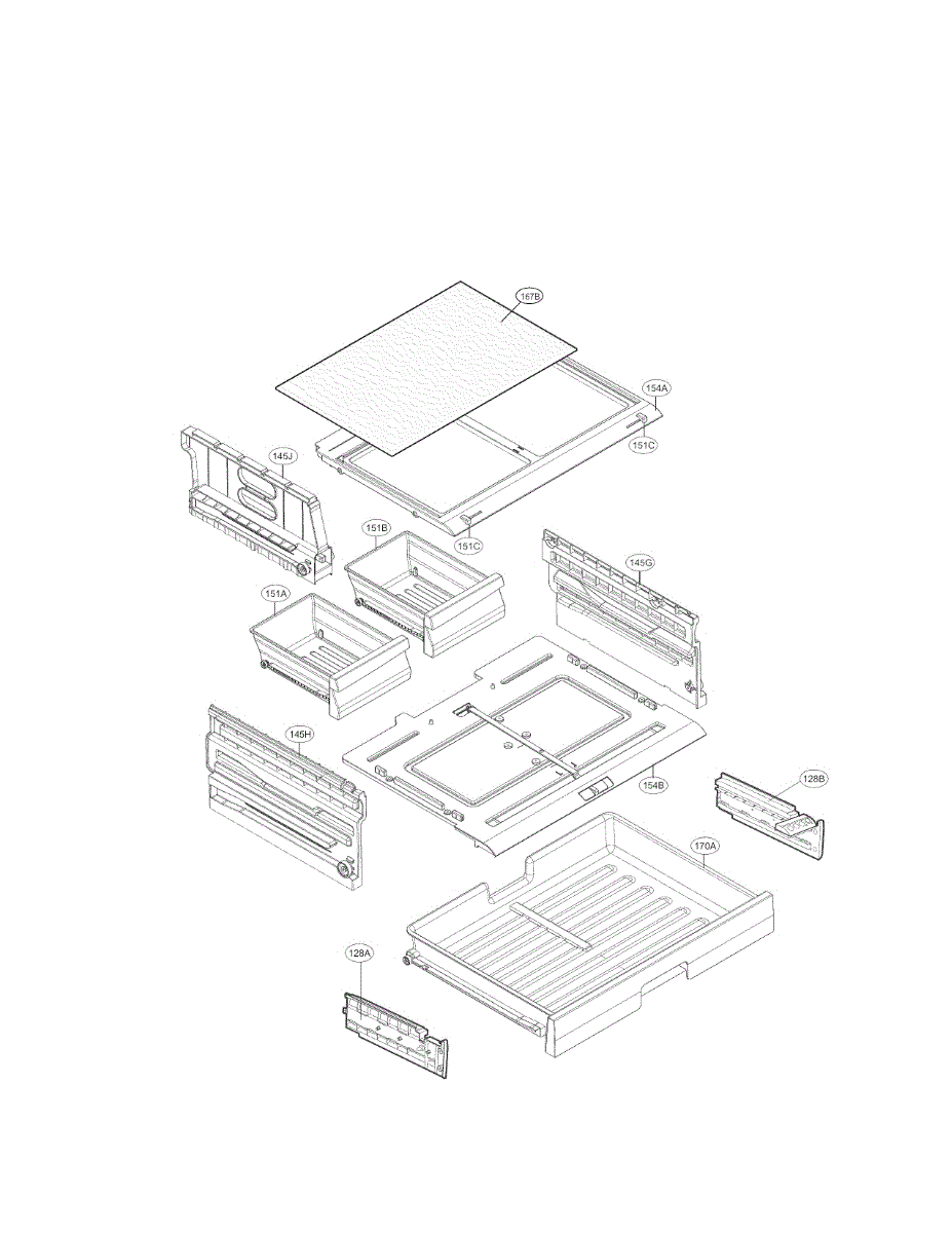 Tray assembly for refrigerator fresh room/crisper drawer. Replaces cracked, warped, or missing trays. Supports produce and contains spills.