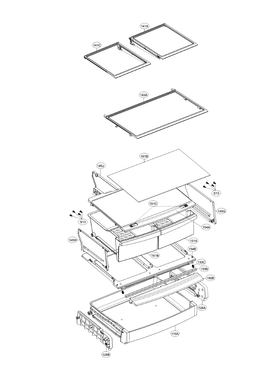 The Glass Shelf is an OEM replacement part for LG refrigerators. It provides sturdy, clear storage for items inside the refrigerator compartment. The glass shelf is designed to seamlessly integrate into the shelf system, dividing interior space for easy organization. Causes of a bad glass shelf can include cracks or chips from heavy items, damage due to impact or mishandling, or general wear and tear over time. Symptoms of a bad glass shelf include: