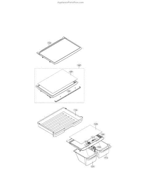The Shelf Assembly is an OEM component for LG refrigerators. It comprises adjustable glass shelves that fit inside the refrigerator and freezer compartments. These shelves provide flexible storage and organization options for various food items.