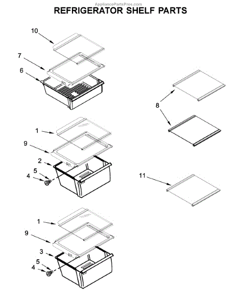 Snack pan organizes smaller items on refrigerator or freezer shelves. Replace if cracked, broken, or missing to restore tidy storage and containment.