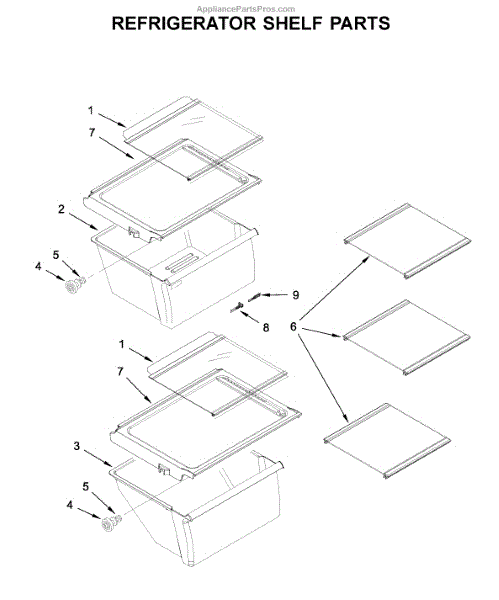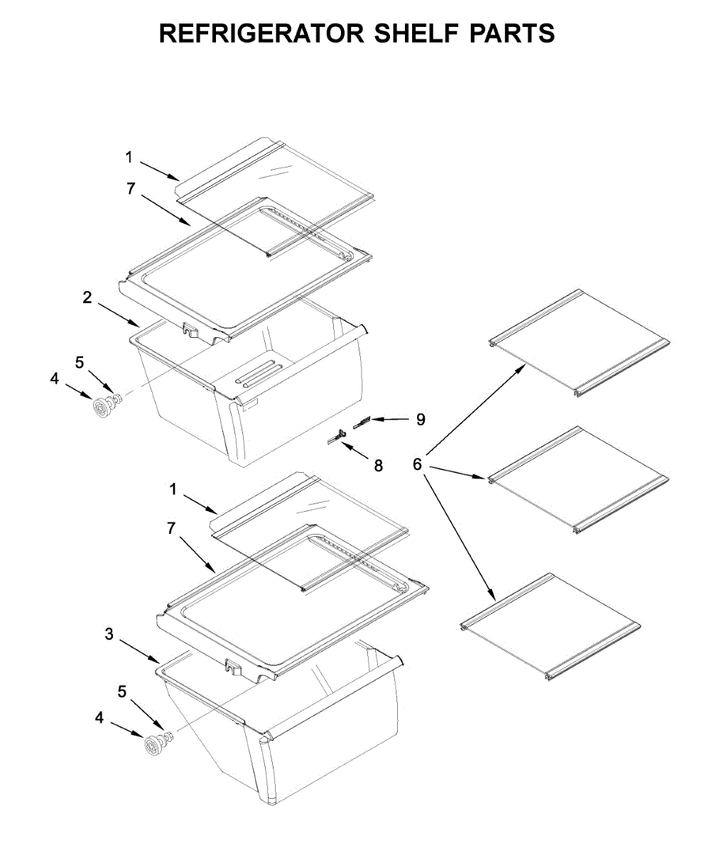 Refrigerator glass shelf that installs inside the fresh food compartment. Replace if cracked, chipped, broken, or missing for safe food storage.