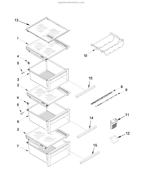 This refrigerator pan cover assembly forms the shelf surface above a drawer and supports the drawer's movement. Replacing a damaged cover restores a level storage surface and smooth, reliable drawer alignment.