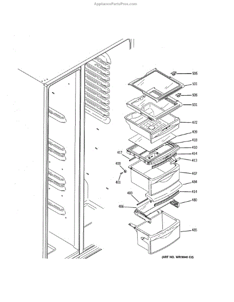 The Drawer Cover is an OEM replacement part for select GE refrigerator vegetable and deli drawers. It protects stored contents from dehydration, contaminants and prolonged illumination while keeping the drawers light-sealed. Proper drawer insulation optimizes food storage conditions. Causes of a bad drawer cover can include cracks and breaks from repeated drawer opening/closing stresses over time. Exposure to produce acids and moisture accelerates degradation of plastic sealing surfaces. Symptoms include: