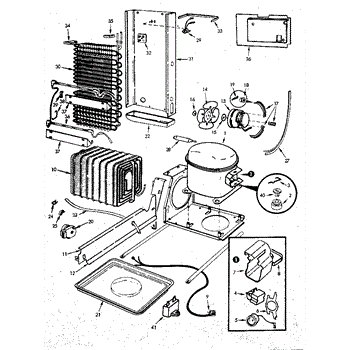 Plastic defrost pan. Evaporator pan hangs from side rails and rests on compressor.