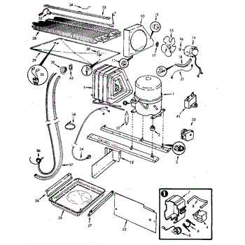 Plastic defrost pan. Evaporator pan hangs from side rails and rests on compressor.